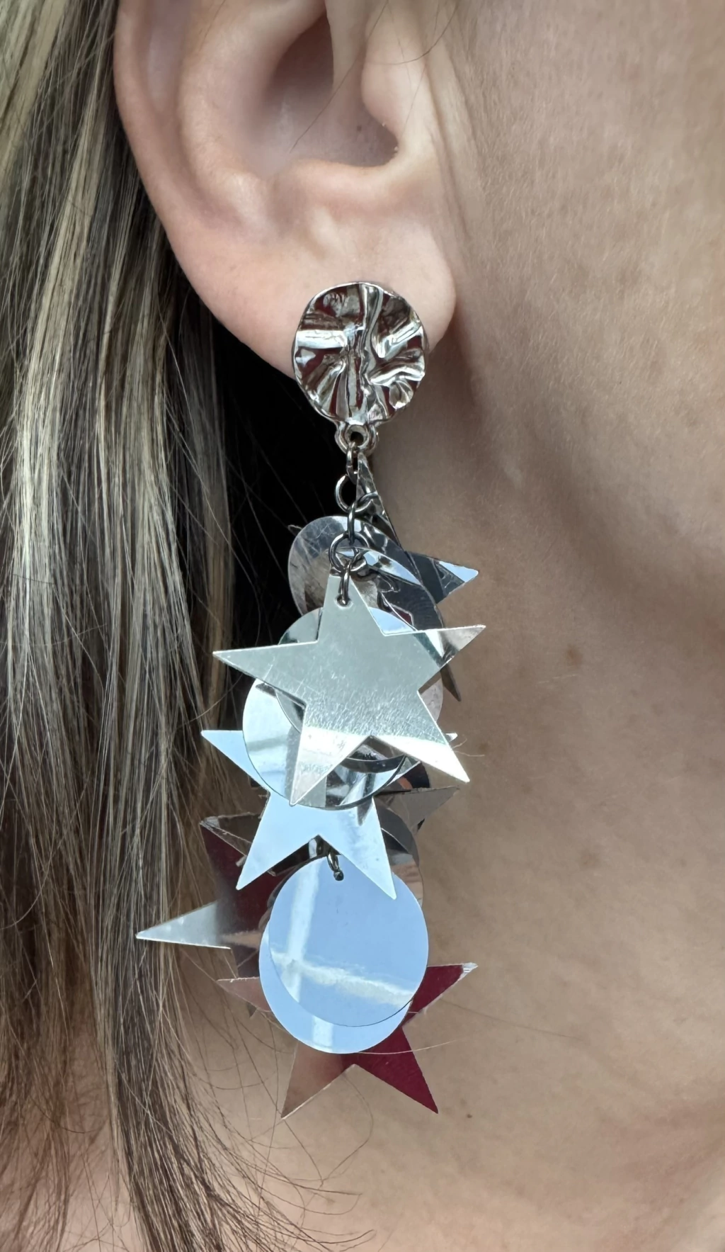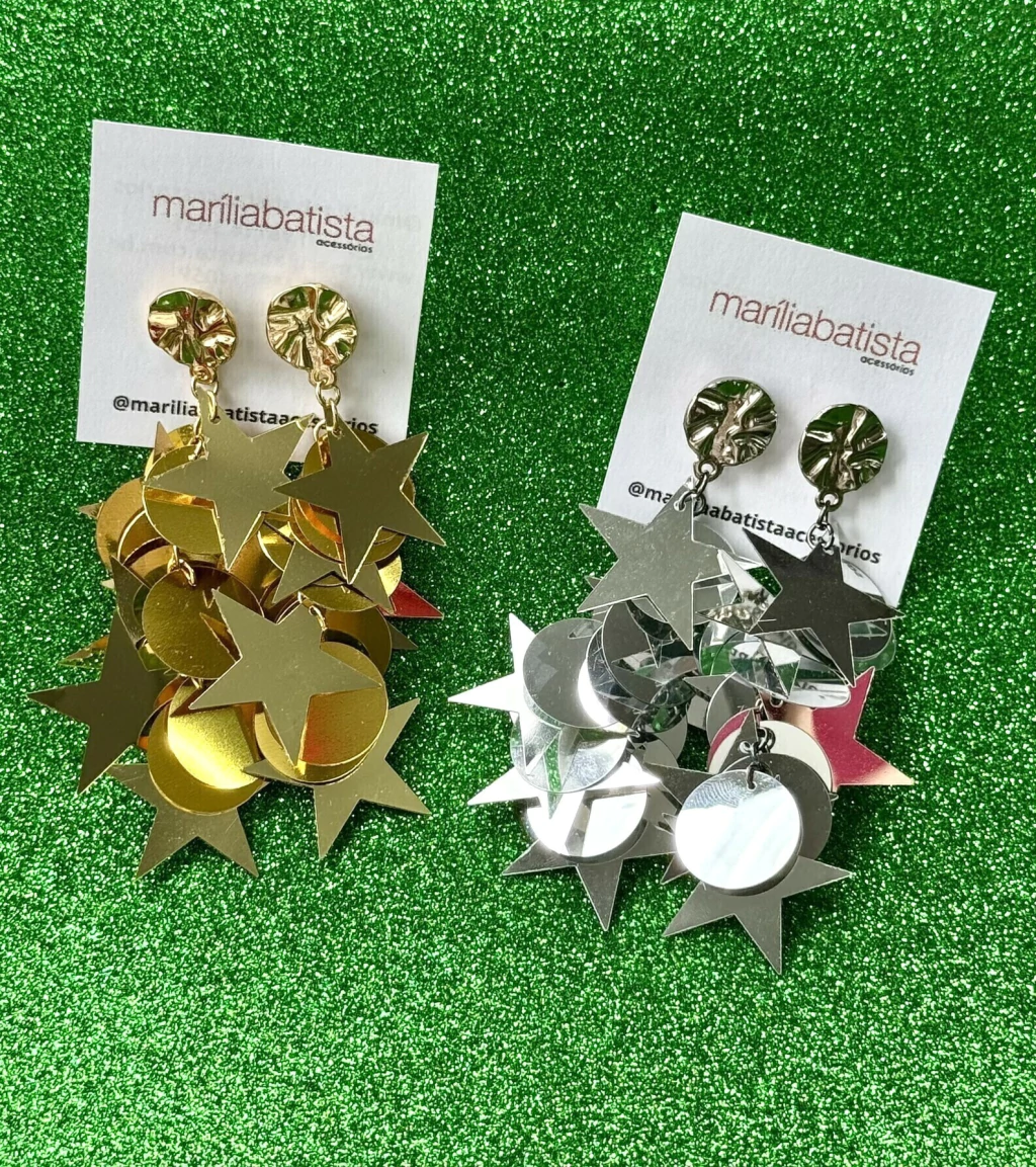 Desperte seu lado festivo com o Brinco com Paetês Redondos e em Formato de Estrela.
