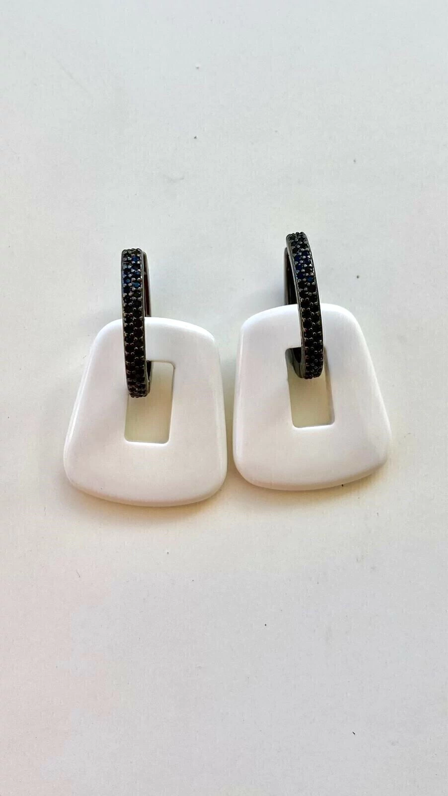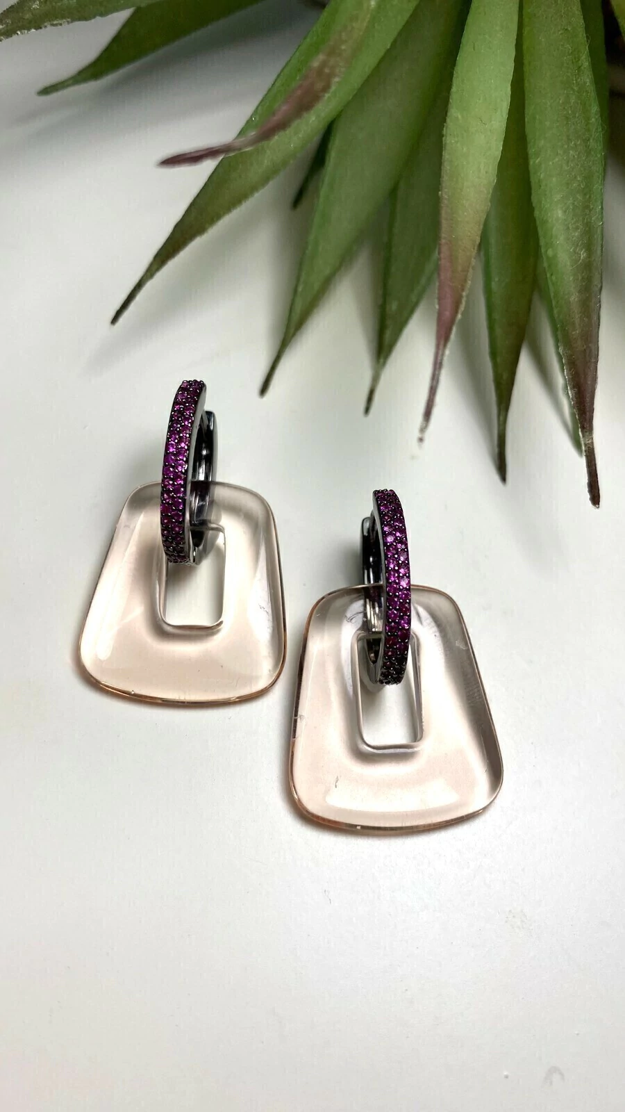 Brinco Esttilo Argola no banho de ródio negro, cravejada em zircônia e pedra vazada em formato geométrico.