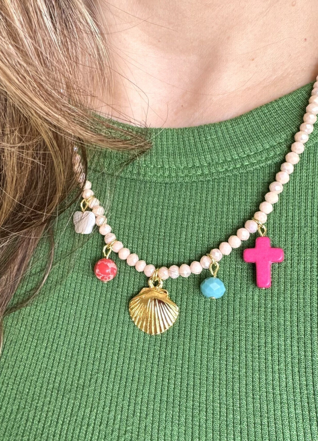 Colar delicado com cristais e pingentes coloridos em formato de concha, cruz, borboleta e pedras.
